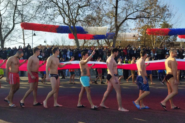 Učesnici Bogojavljenog plivanja za Časni krst danas su u Zemunu nosili najdužu zastavu u istoriji Srbije!