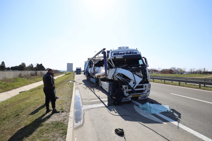 Teretno vozilo grčkih registarskih oznaka udarilo je u kamion bugarskih registarskih oznaka, nakon čega je došlo do ispadanja tereta iz oba vozila na kolovoz.