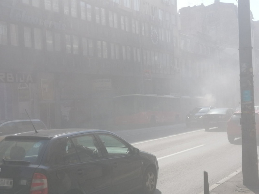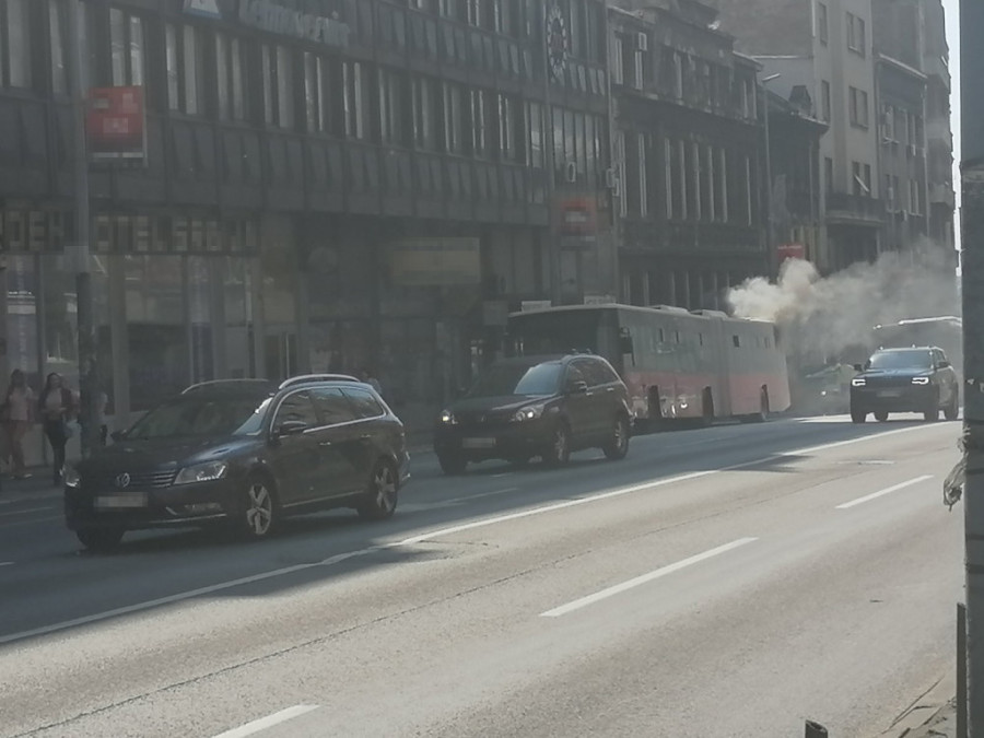 Kako javlja naš reporter, gusti dim i dalje izlazi iz zadnjeg dela vozila, a nesnosan smrad paljevine se širi po ovom delu grada.