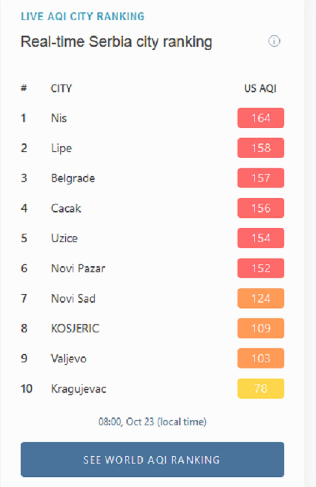 Takođe, po podacima stanice “Air Visual”, Srbija se nalazi na petom mestu po zagađenosti vazduha u svetu, dok se ispred nje nalazi Kina, zatim Ujedinjeni Arapski Emirati, Pakistan, dok je Indija zauzela prvo mesto po zagađenosti vazduha.