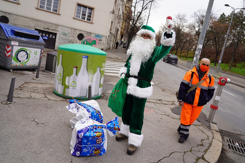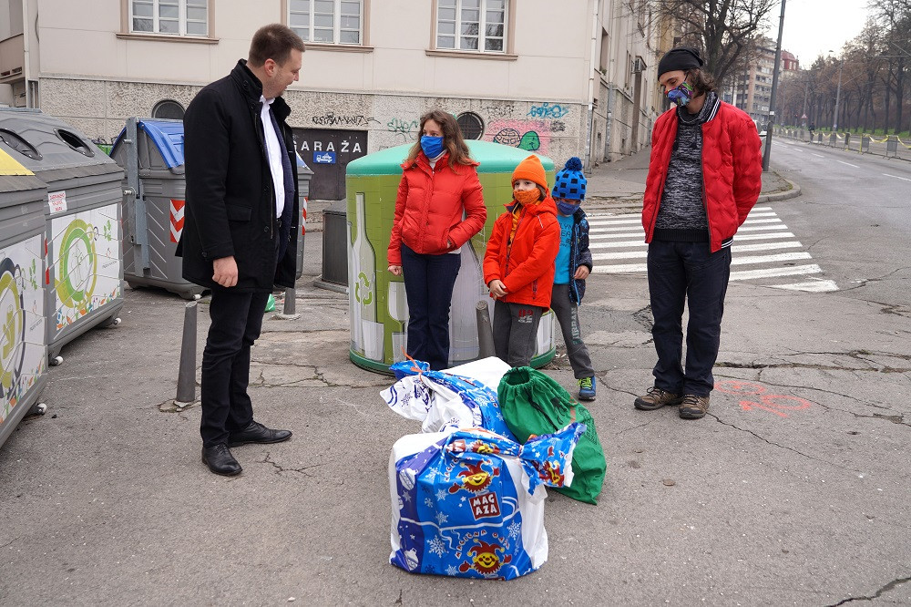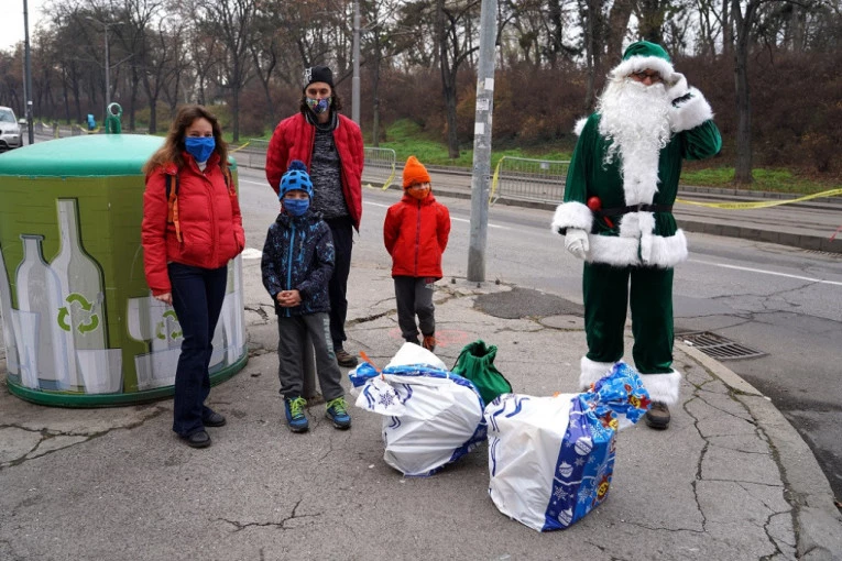 Sedmogodišnji blizanci sa Dorćola Srđan i Mladen Cvijić koji zajedno sa roditeljima recikliraju otpad, danas su od “Gradske čistoće” dobili novogodišnje paketiće sa slatkišima i igračkama, koje je im je uručio “ekološki” Deda Mraz, za doprinos čistoći grada.