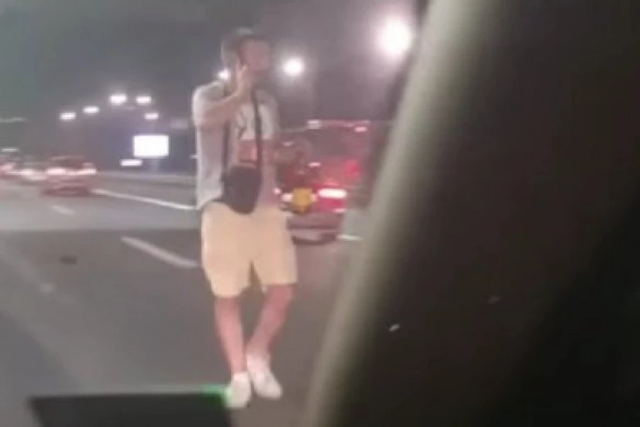 Kako se vidi na snimku objavljenom na društvenim mrežama, mladić u šortsu i majici u jednoj ruci drži alkoholno piće, dok mu je u drugoj telefon, i kreće se auto-putem na Autokomandi.