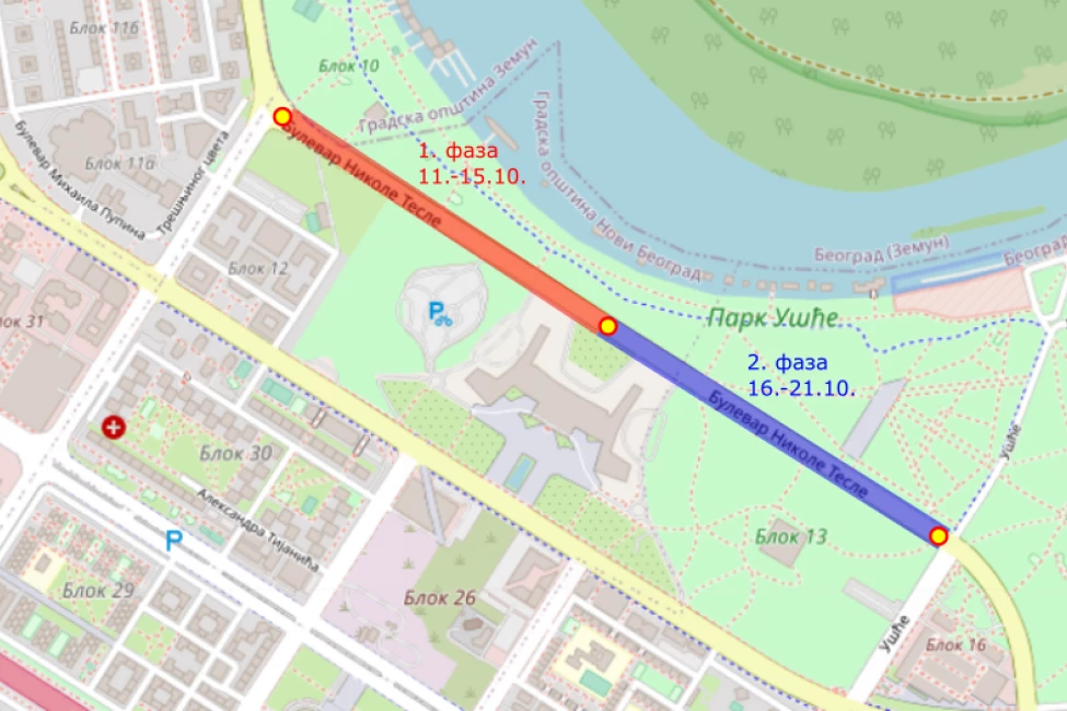 Tokom izvođenja radova JKP "Beograd put" na redovnom održavanju kolovoza na Bulevaru Nikole Tesle u periodu od 11. do 21. 10. 2022. godine doći će do potpune obustave saobraćaja po fazama.