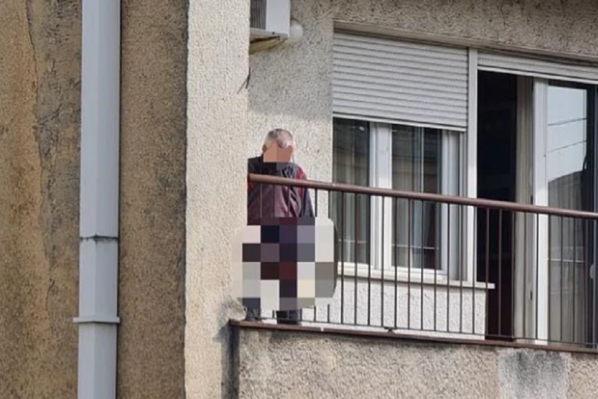 Kako je prikazano na fotografiji, deda iz jedne zgrade, u Ulici kralja Petra, stoji na terasi i urinira po pešacima koji prolaze tuda.