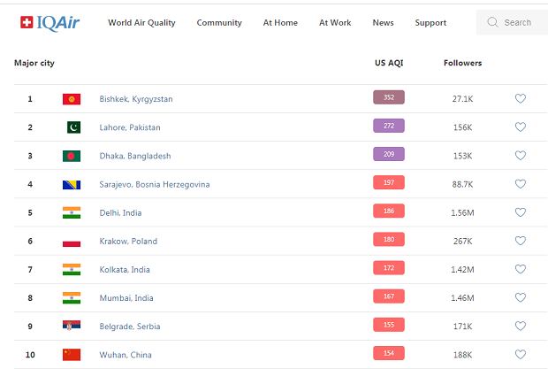 Tako je danas, srpski grad, posle dužeg vremena, ponovo među najzagađenijim, s koeficijentom od 155, dok su ispred njega Sarajevo, Delhi, Krakov, Mumbai…