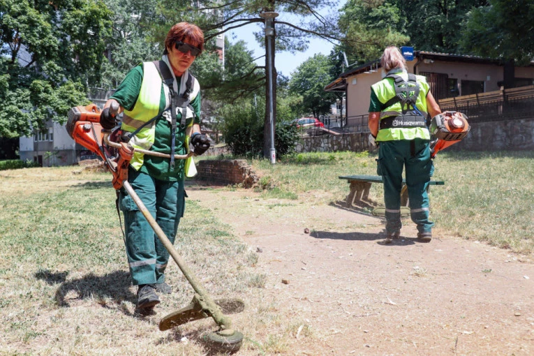 Ove žene, i po najvećim vrućinama, sa sve alatom – trimerom teškim oko 11 kilograma – uređuju prestoničke zelene oaze. Tako je bilo i ovih dana.
