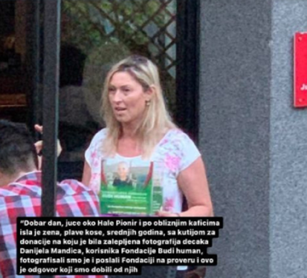 Kako su građani naveli, u pitanju je ženska osoba, srednjih godina, sa plavom kosom, koja se predstavlja u ime fondacije “Budi human”, kao i da prikuplja novac za dečaka Danijela Mandića.