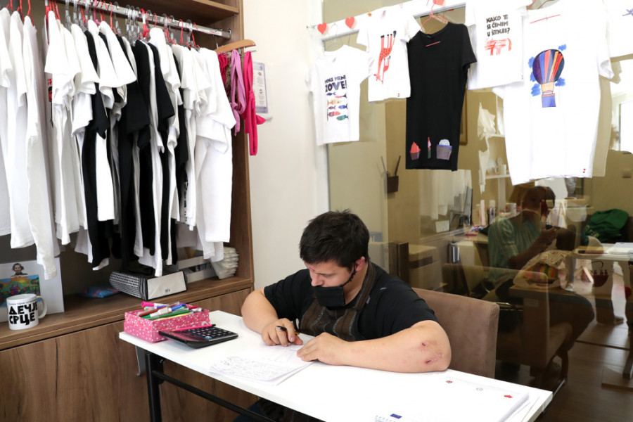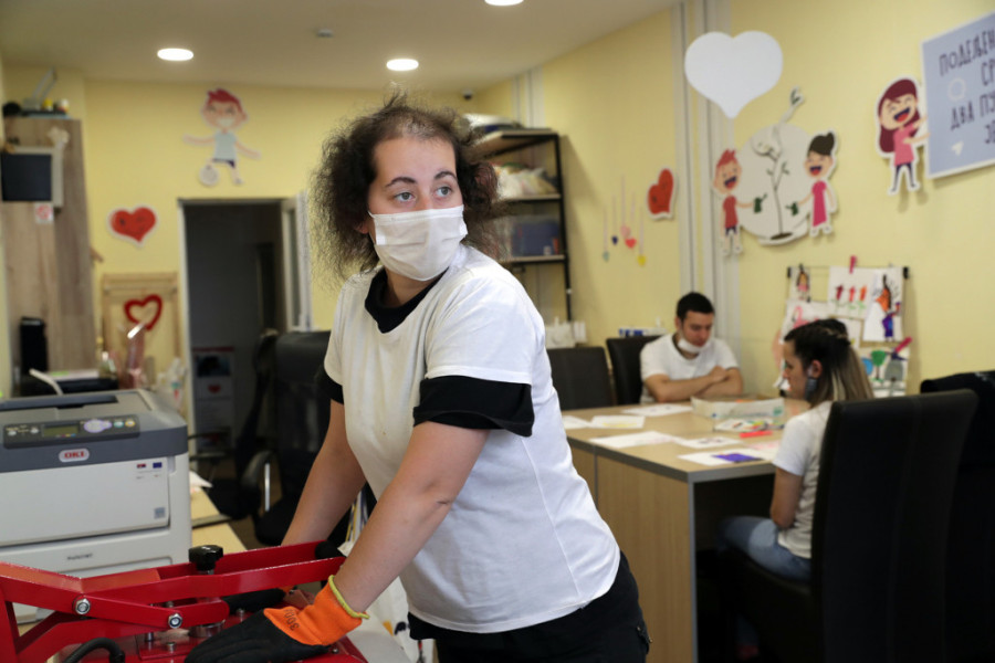 – Imamo baštu u Vrčinu, gde smo svi zajedno zasadili lavandu, smilje, pa čak i grožđe… Bitno je što oni jako vole promenu i dinamiku, a upravo zbog toga radionica i prodavnica postoje. Dva puta nedeljno nam dolazi šnajderka (instruktorka) koja radi sa njima i uči ih da šiju od cegera, preko vrećica za lavandu, do porube na majicama ili etikete. Takođe, mogu i da vezu. Štampu radimo svakodnevno i mislim da uživaju u tome, jer su na cegerima i majicama njihovi autentični radovi – kaže ona.