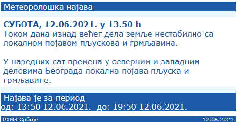 Republički hidrometeorološki zavod objavio je na svom sajtu da se očekuje lokalna pojava pljuska i grmljavine u severnim i zapadnim delovima Beograda.