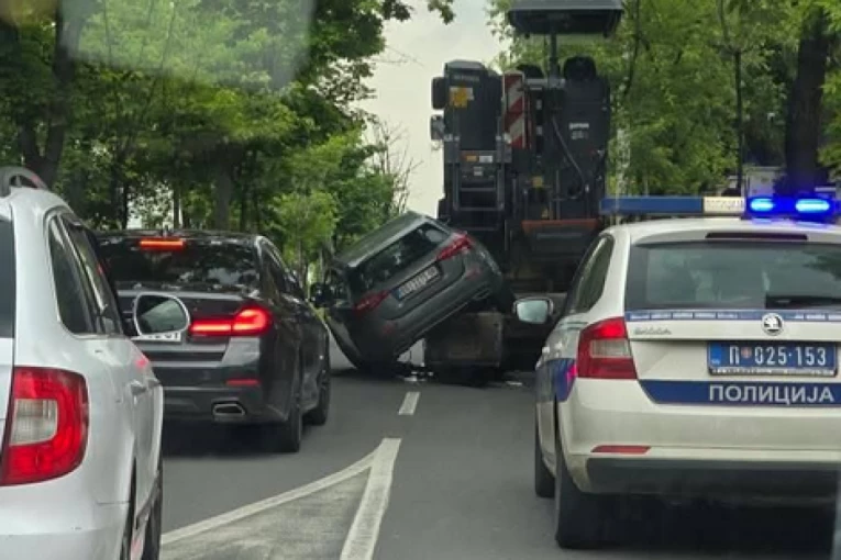 Kakva drama! Pogledajte kako se automobil popeo na mašinu za asfaltiranje (FOTO)