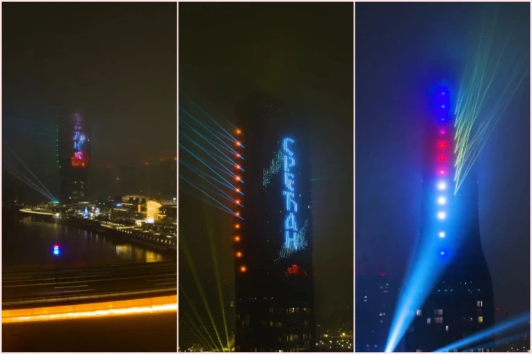 - Tokom Badnjeg dana, kroz motive badnjaka i poruku 'Srećan Badnji dan', sa Kule je simbolično najavljen dolazak Božića", navodi se u saopštenju i dodaje da je tačno u ponoć, sa vrha Kule upućen tradicionalni praznični pozdrav "Mir Božiji, Hristos se rodi", koji je zajedno sa laserima obasjao srpsku prestonicu i poslao snažnu poruku mira, ljubavi i nade.