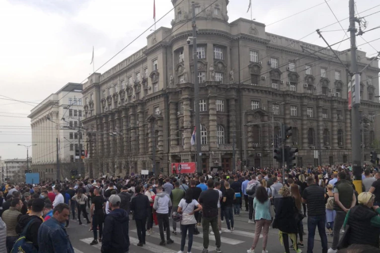Tačno u 17 časova učesnici protesta su blokirali saobraćaj u Nemanjinoj i Ulici Kneza Miloša