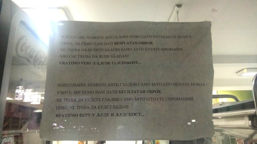 Poštovani, nemojte biti gladni samo zato što nemate novca, uđite, mi ćemo vam dati besplatan obrok. Ne treba da budete gladni samo zato što ste siromašni. Niko ne treba da bude gladan! Vratimo veru u ljude i ljudskost…