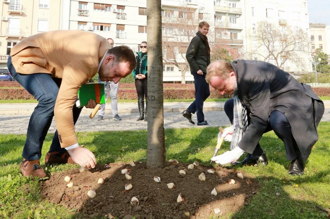 Glavni urbanista Marko Stojčić i ambasador Kraljevine Holandije u Srbiji Jost Reinćes zasadili su danas na platou ispred Starog dvora lale u okviru promocije projekta "Zeleni gradovi Srbije".