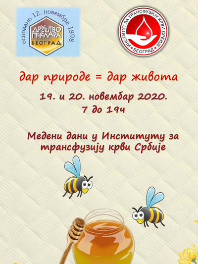 U čast obeležavanja 122 godine od osnivanja, Društvo pčelara „Beograd” obradovaće teglicom domaćeg meda sve davaoce krvi koji budu donirali krv u Institutu za transfuziju krvi Srbije. Akcija će se održati sutra i prekosutra u Institutu za transfuziju krvi Srbije od 7 do 19 časova.