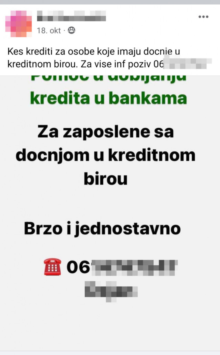 Ovako glasi oglas koji se već neko vreme "vrti" po društvenim mrežama, najčešće na stranicama na kojima se oglašavaju iznajmljivanje i prodaja stanova. Na kraju napisanog teksta i ponude navodne "pomoći“ za dobijanje kredita, uredno su ostavljeni ime i broj mobilnog telefona na koji "zainteresovani“ mogu da se jave.