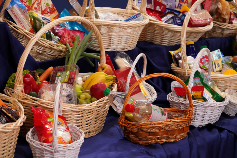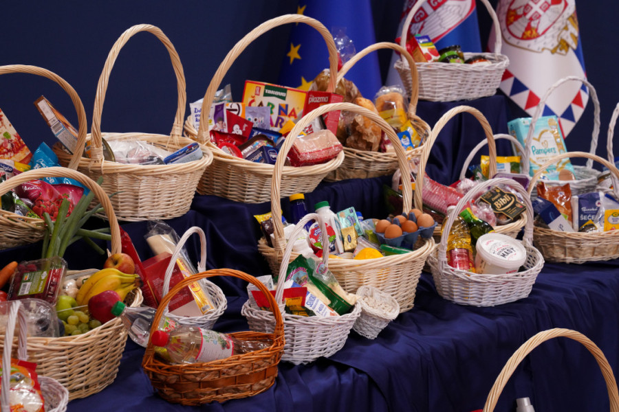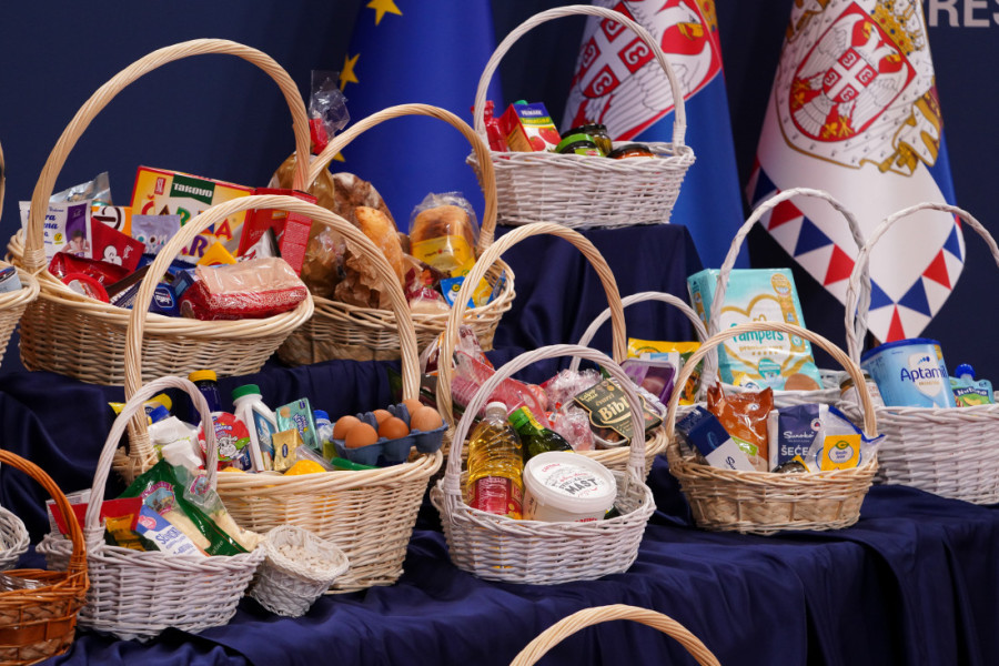 Na stolu ispred nalazile su se korpe sa namirnicama o čijim cenama je govori predsednik.