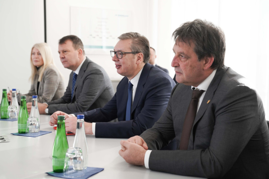 Predsednik Srbije Aleksandar Vučić prisustvuje svečanoj ceremoniji polaganja kamena temeljca za izgradnju nove fabrike kompanije "Muehlbauer Group" u Staroj Pazovi.