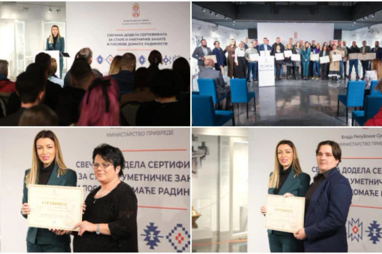 Potpredsednica Vlade i ministarka privrede Adrijana Mesarović uručila je danas, u Etnografskom muzeju, 32 sertifikata za stare i umetničke zanate i poslove domaće radinosti dobitnicima iz 12 okruga.