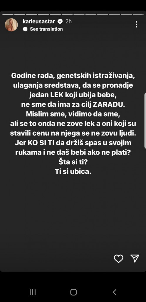 - Odbijam da poverujem da je čovek čoveku u stanju da naplati lek 2,5 miliona dolara. I to ne čovek čoveku nego čovek, doktor - BEBI! Za bebin život! Na kakvoj planeti mi to živimo?! Zar je to ono do čega je čovečanstvo došlo? "Zolgensma" lek za spinalnu mišićnu atrofiju koji samo u jednoj dozi leči... Ko je stavio cenu na taj lek? Lek koji se daje samo bebama... Kako smo to kao ljudska rasa dozvolili?! Ovaj lek mora da bude besplatan!!!!!! - napisala je Karleuša.