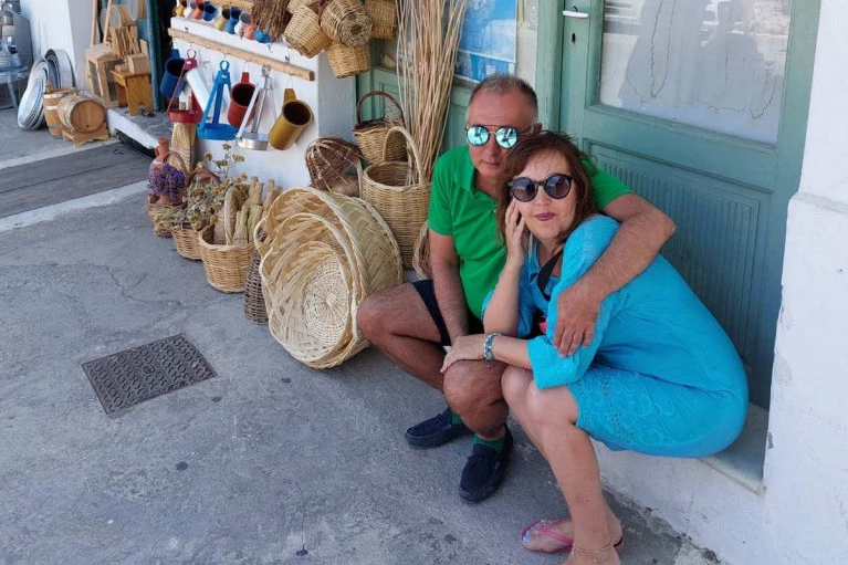 - Osmehnem se i svakog puta im ispričam pričicu sa aktuelnog letovanja, kao razlog odlaska u Grčku. Naksos, drugi dan boravka na njemu. Već smo obišli Santorini, Ios i obe Koufunisije, kao i Irakliju. Odlučujemo da iznajmimo automobil i obiđemo kopnenih deo ostrva. Stižemo u udaljenije selo, Filoti i jedva pronalazim mesto za parkiranje u "mršavom" hladu. Spuštamo se pešice nizbrdo i pažnju nam privlači šarenilo zanatskih proizvoda ispred male radnje.
