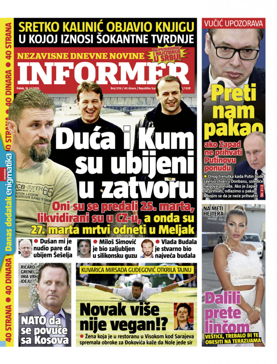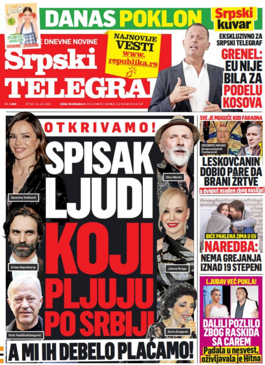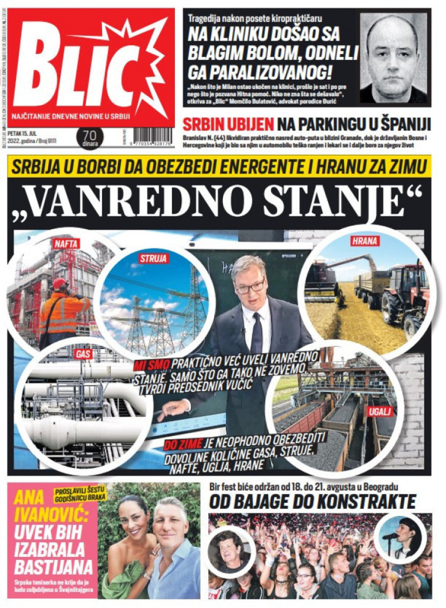 Dnevne novine u Srbiji za petak 15. jul 2022. godine na naslovnim stranama najavljuju brojne aktuelne društveno-političke teme i donose ekskluzivne priče.