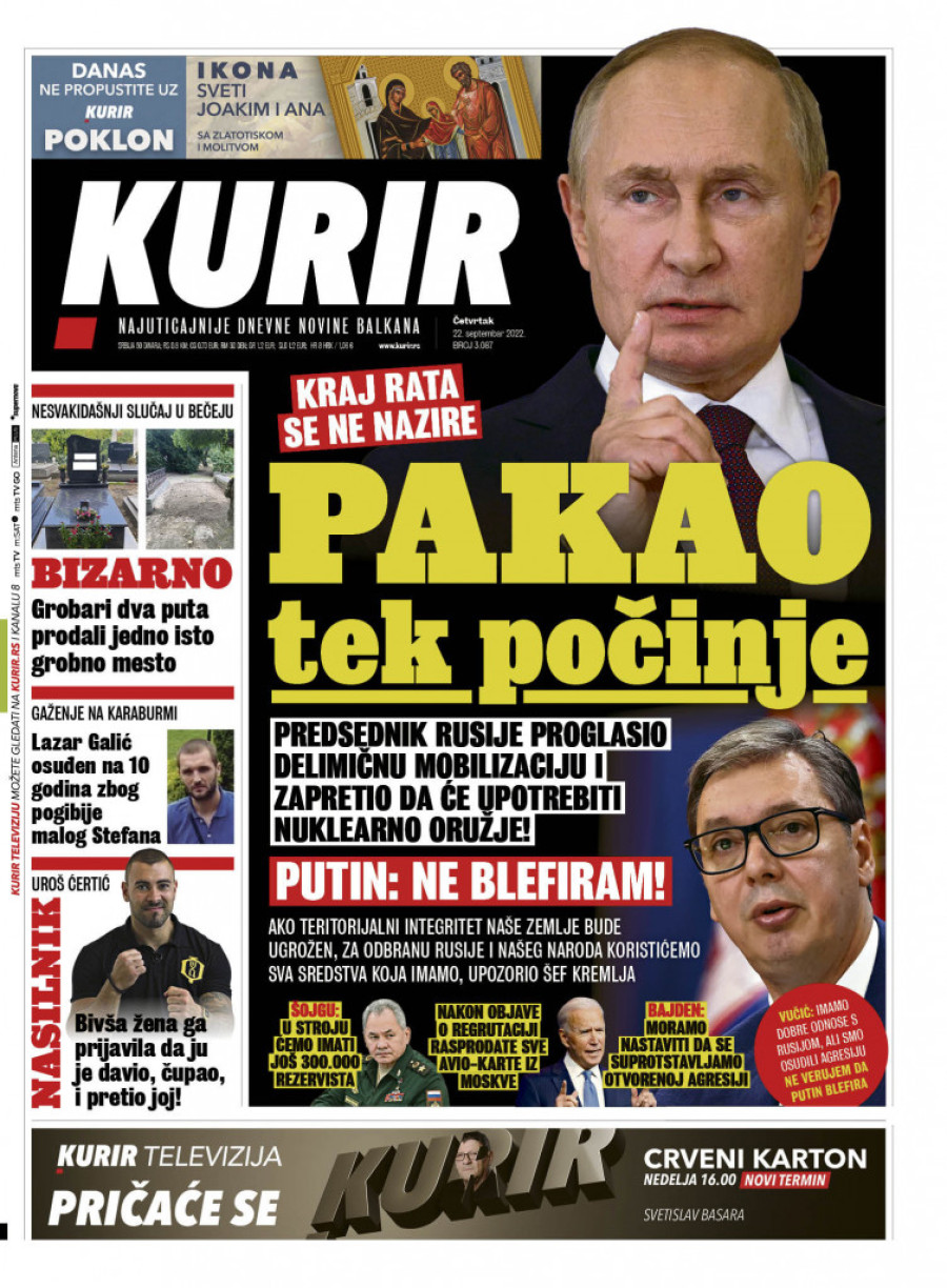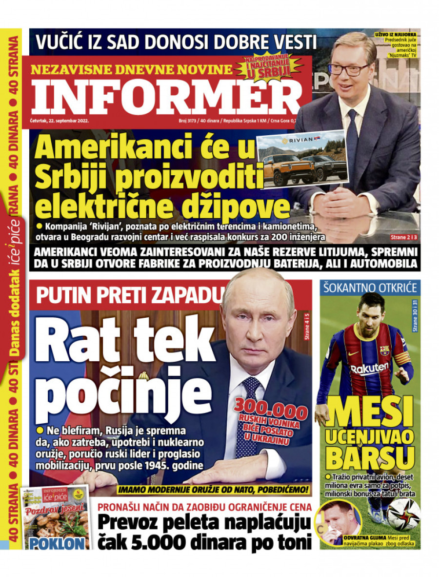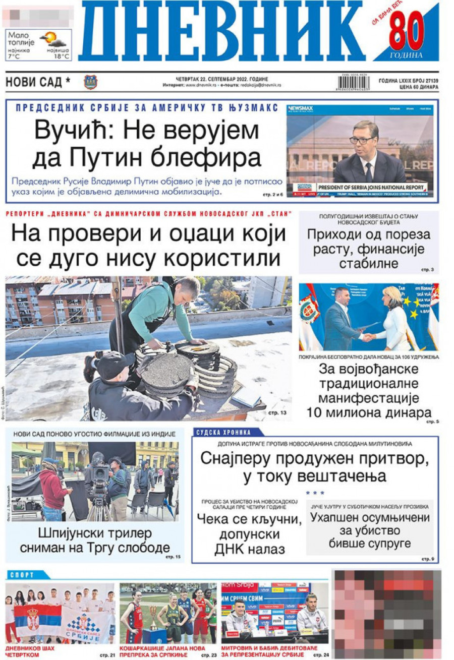 Dnevne novine u Srbiji za četvrtak 22. septembar 2022. godine na naslovnim stranama najavljuju brojne aktuelne društveno-političke teme i donose ekskluzivne priče.