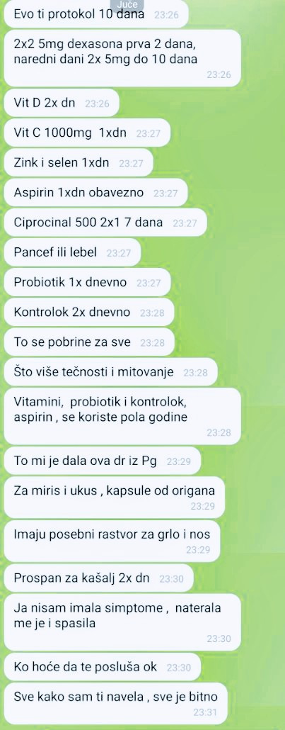 Rođaci, komšije, prijatelji među sobom šalju poruke, u kojima je spisak lekova koje je koristila zaražena osoba. “24sedam” imao je uvid u jedno takvo “lečenje”. Osoba u poruci prilaže terapiju za 10 dana, uz precizan spisak lekova i dijetetike, koju joj je, navodno, lekar propisao dok je bolovala od koronavirusa.