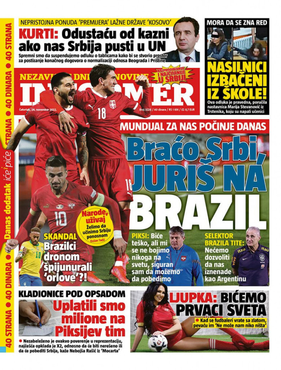 Dnevne novine u Srbiji za četvrtak 24. novembar 2022. godine na naslovnim stranama najavljuju brojne aktuelne društveno-političke teme i donose ekskluzivne priče.