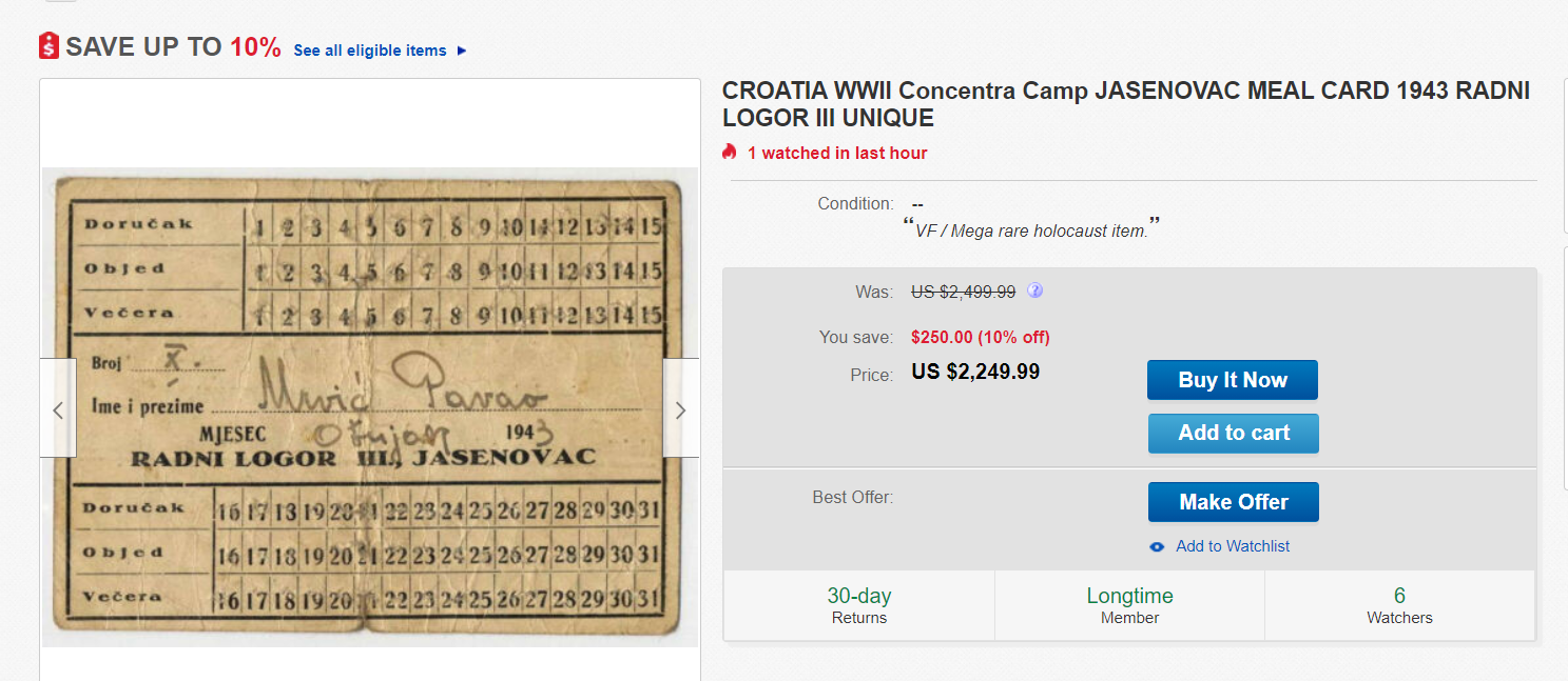 Prodaja ličnih stvari, dokumenata i predmeta iz koncentracionog logora Jasenovac, koja se pojavila na sajtu za internet prodaju E-Bay moralno je neopravdana i