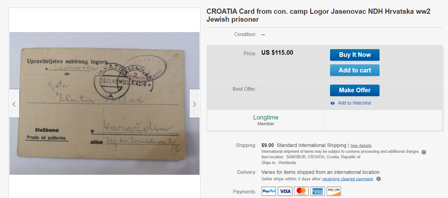 Većina onih koji ove stvari prodaju su iz Hrvatske, neki su iz Austrije ili Slovenije i Amerike. Nudi se svašta, od pisama logoraša do jelovnika koji su dobijali nesrećni ljudi, Jevreji, Srbi, Romi, koje je ustaška vlast zatvorila u jedan od najstrašnijih logora u Drugom svetskom ratu.