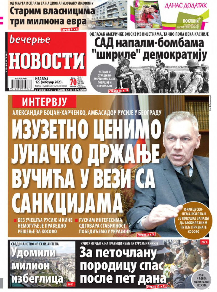 Dnevne novine u Srbiji za nedelju 12. februar 2023. godine na naslovnim stranama najavljuju brojne aktuelne društveno-političke teme i donose ekskluzivne priče.
