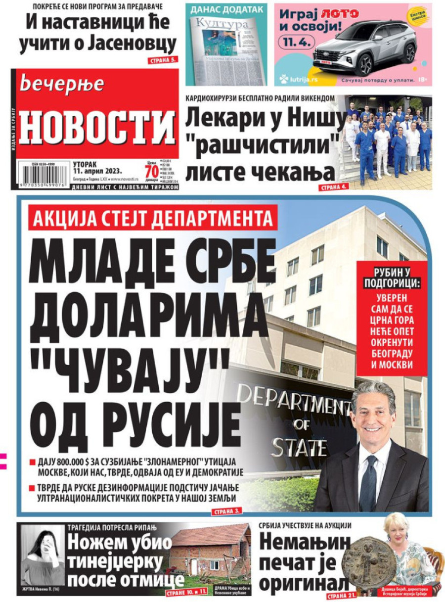 Dnevne novine u Srbiji za utorak 11. april 2023. godine na naslovnim stranama najavljuju brojne aktuelne društveno-političke teme.