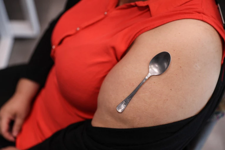 Prislonila je novčić na ruku. Potom ga je pustila. I on je ostao na koži. Baš isto kao i kod vakcinisane ispitanice, ali i kod dvojice jučerašnjih ispitanika. Potom je uzela metalnu kašiku. Ponovila je postupak kao sa novčićem. I, kao što vidite, i ona je stajala.