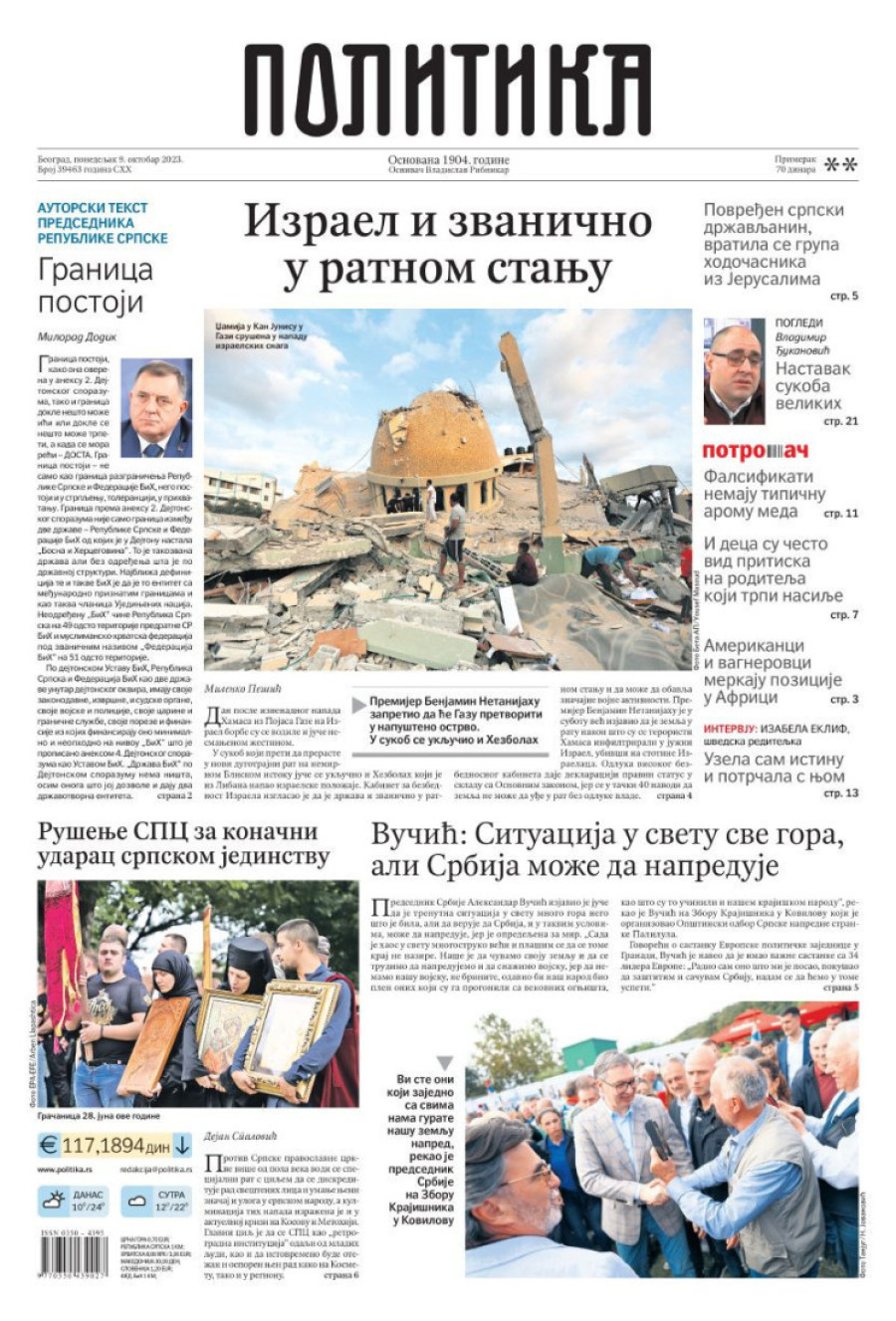 Dnevne novine u Srbiji za ponedeljak 9. oktobar 2023. godine na naslovnim stranama najavljuju brojne aktuelne društveno-političke teme.