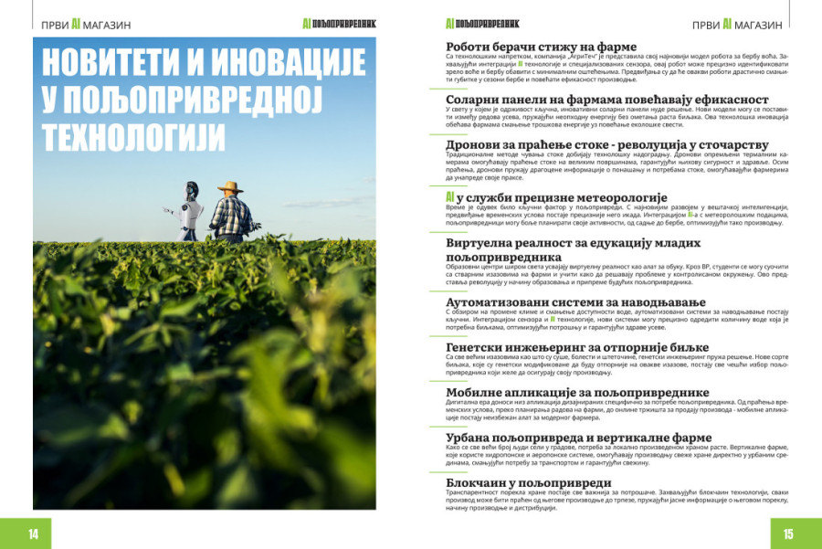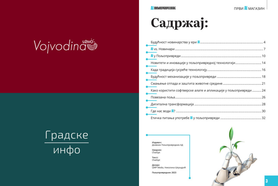 Jedna od njih je da može sama da piše novinske članke, kao i da pravi ili bira prigodne fotografije koje bi išle u tekst. Tako je redakcija lista "Poljoprivrednik", koji postoji već 66 godina, odlučila da napravi prvi srpski magazin koji je napisala i delimično ilustrovala veštačka inteligencija.