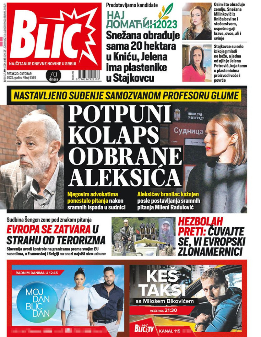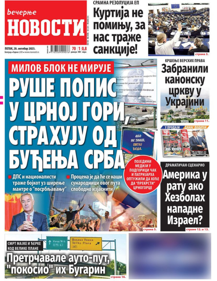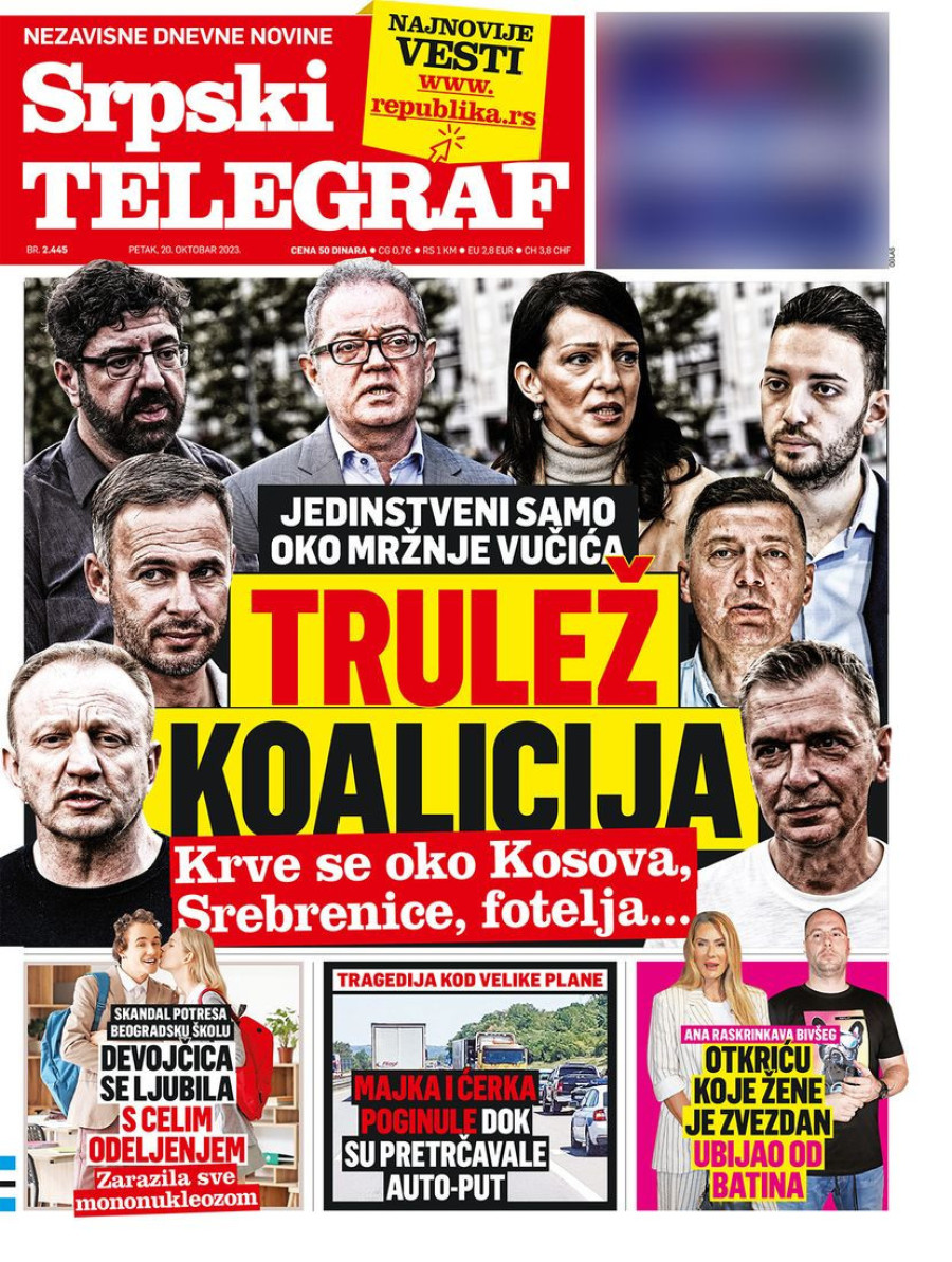Dnevne novine u Srbiji za petak 20. oktobar 2023. godine na naslovnim stranama najavljuju brojne aktuelne društveno-političke teme.