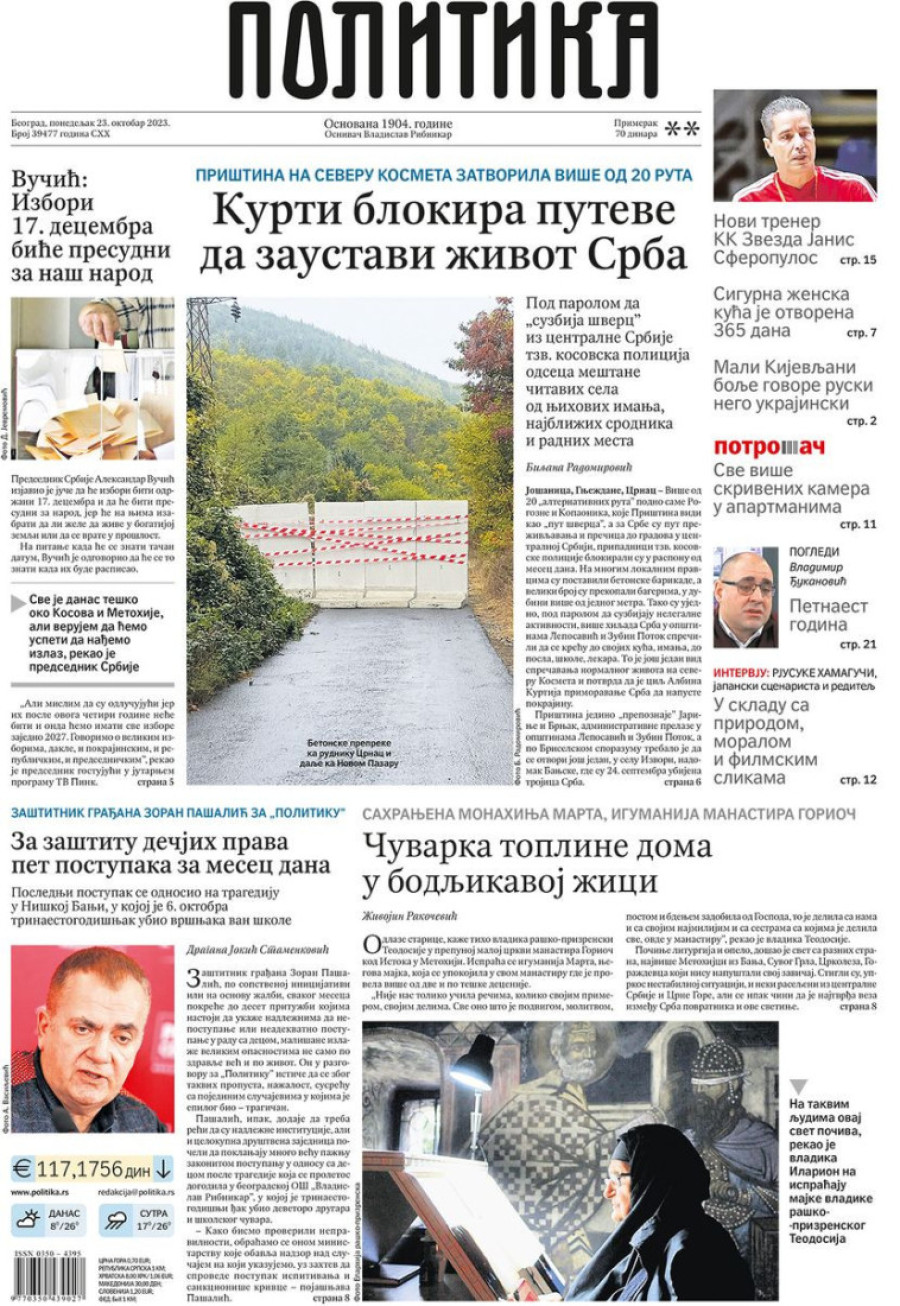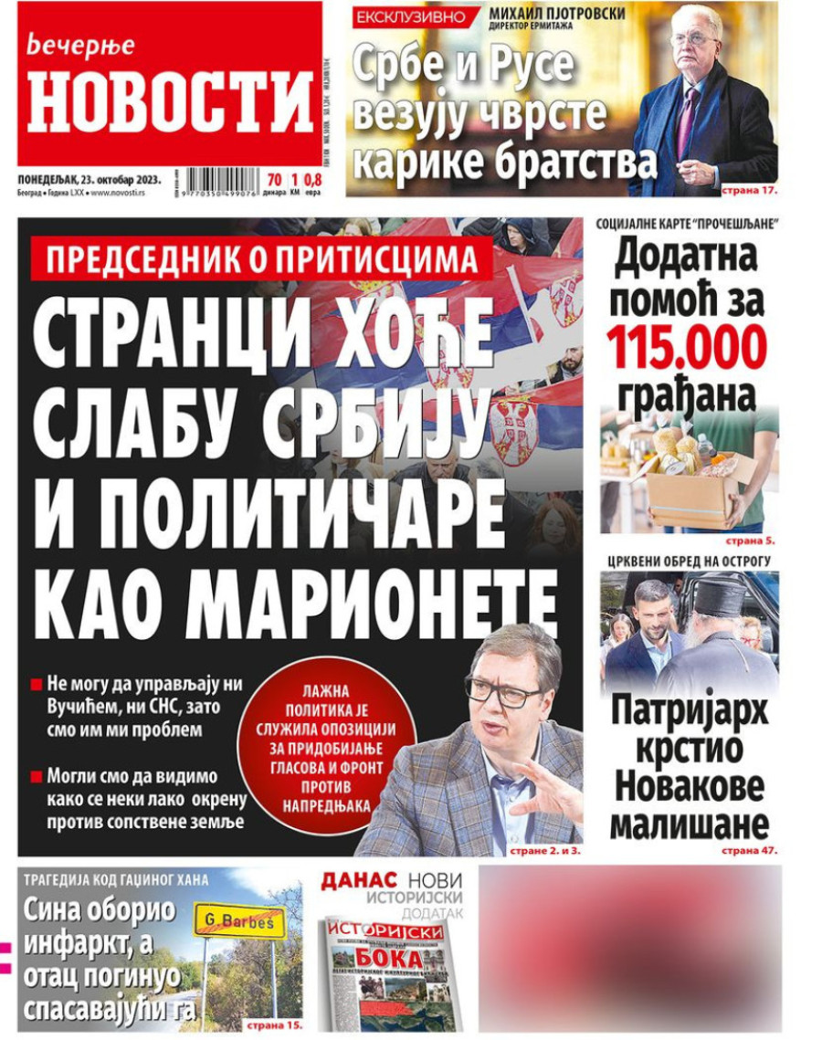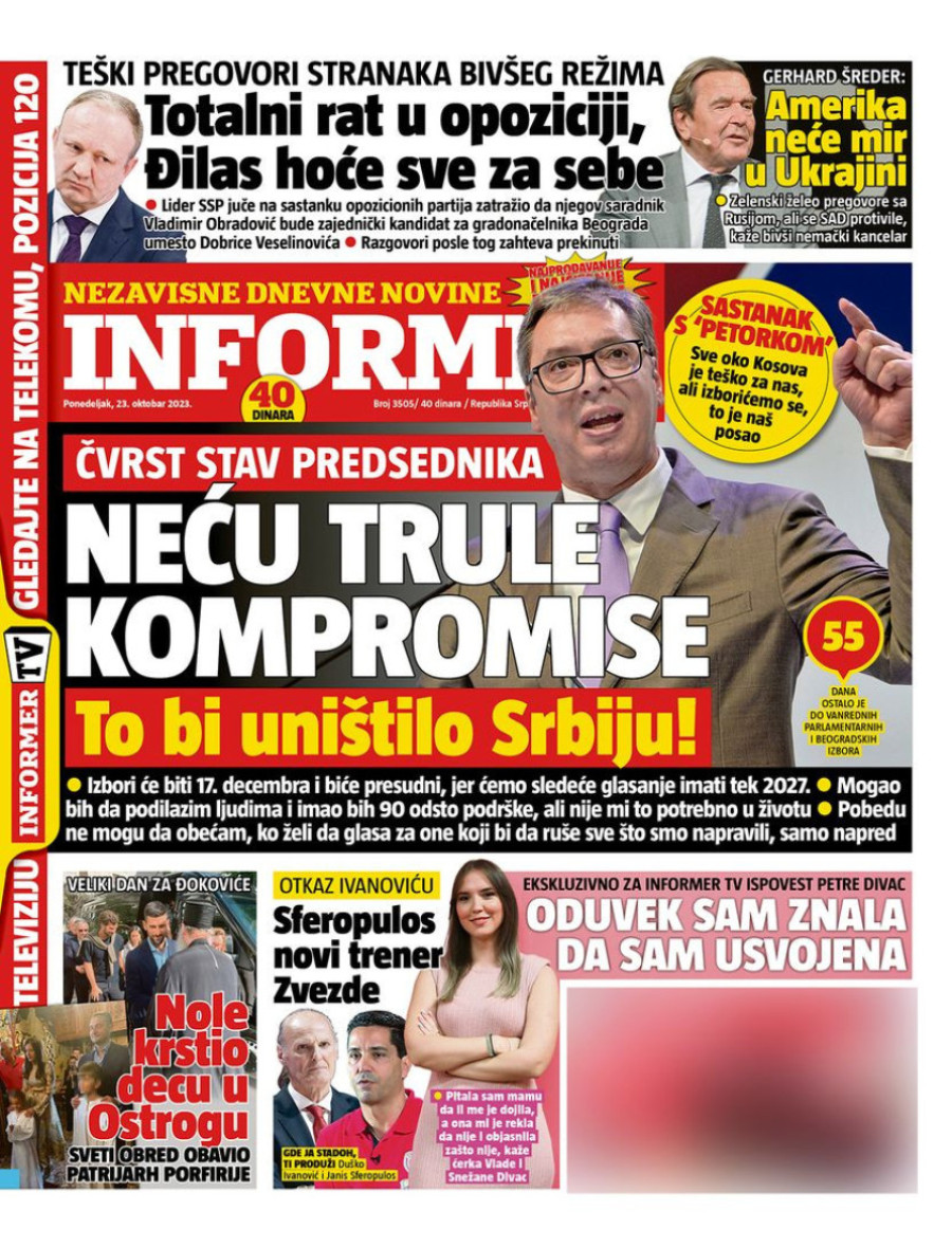 Dnevne novine u Srbiji za ponedeljak 23. oktobar 2023. godine na naslovnim stranama najavljuju brojne aktuelne društveno-političke teme.