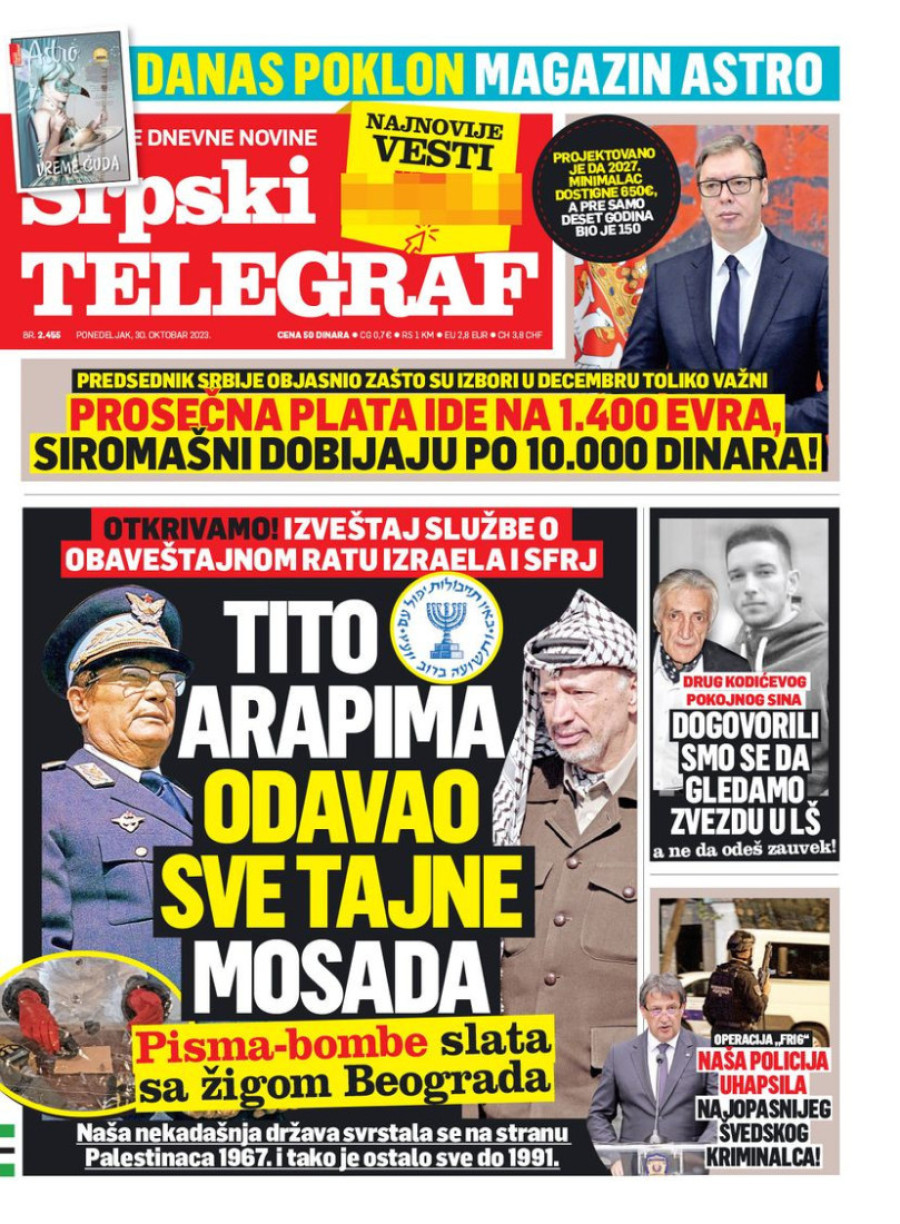 Dnevne novine u Srbiji za ponedeljak 30. oktobar 2023. godine na naslovnim stranama najavljuju brojne aktuelne društveno-političke teme.