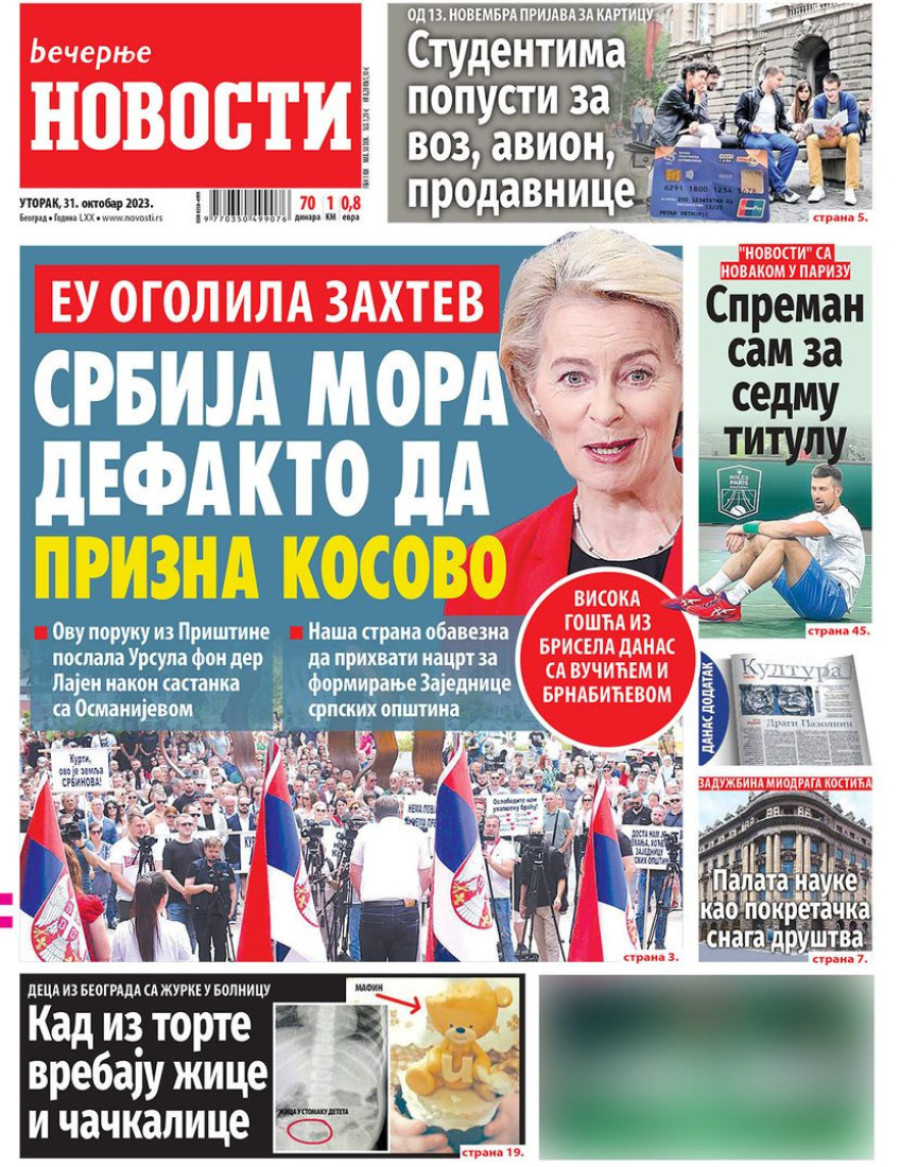 Dnevne novine u Srbiji za utorak 31. oktobar 2023. godine na naslovnim stranama najavljuju brojne aktuelne društveno-političke teme.