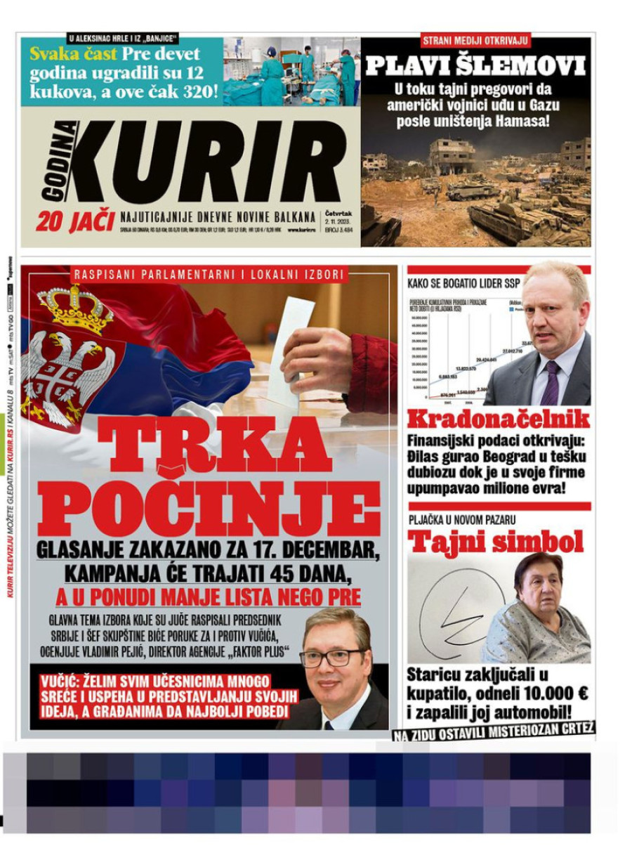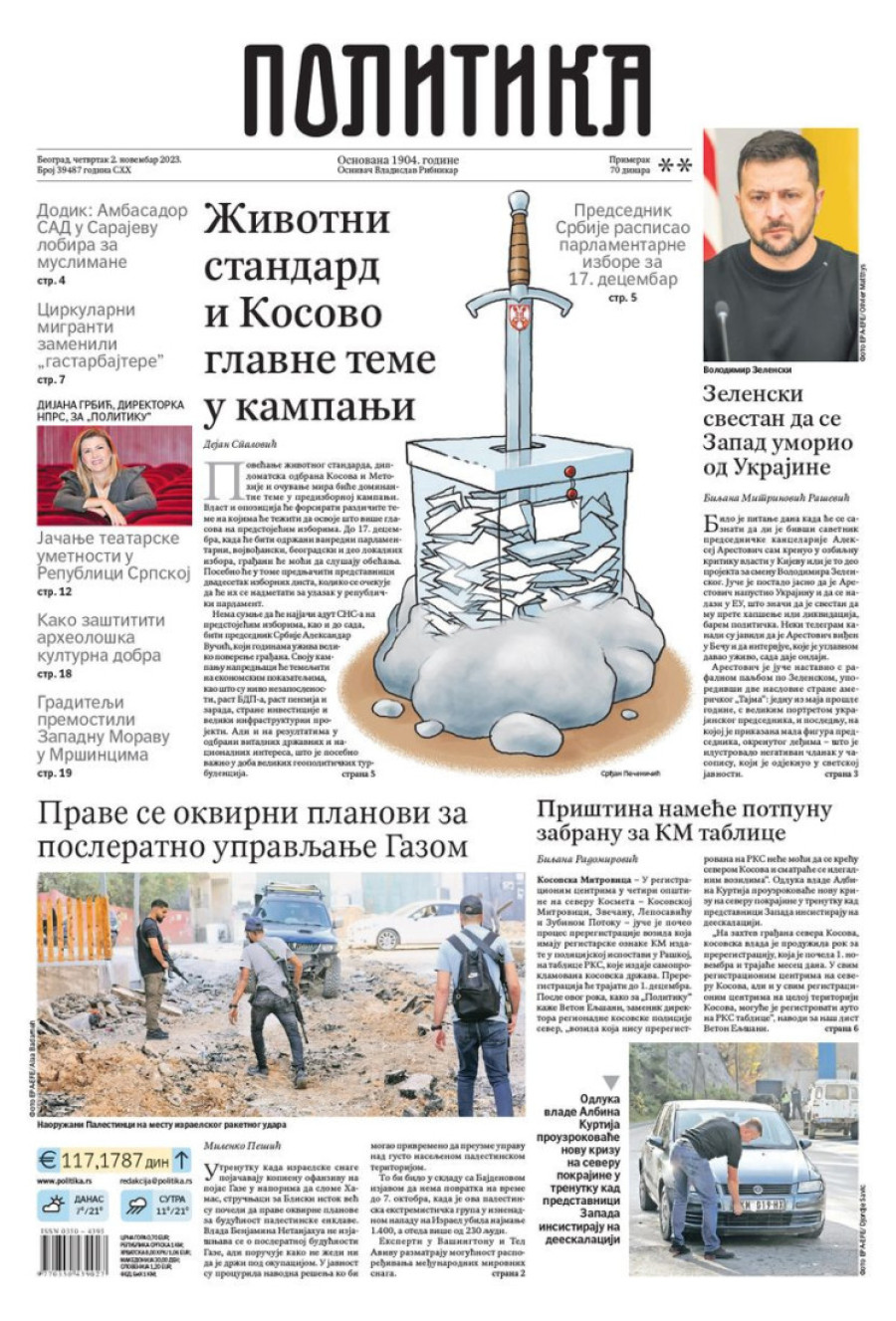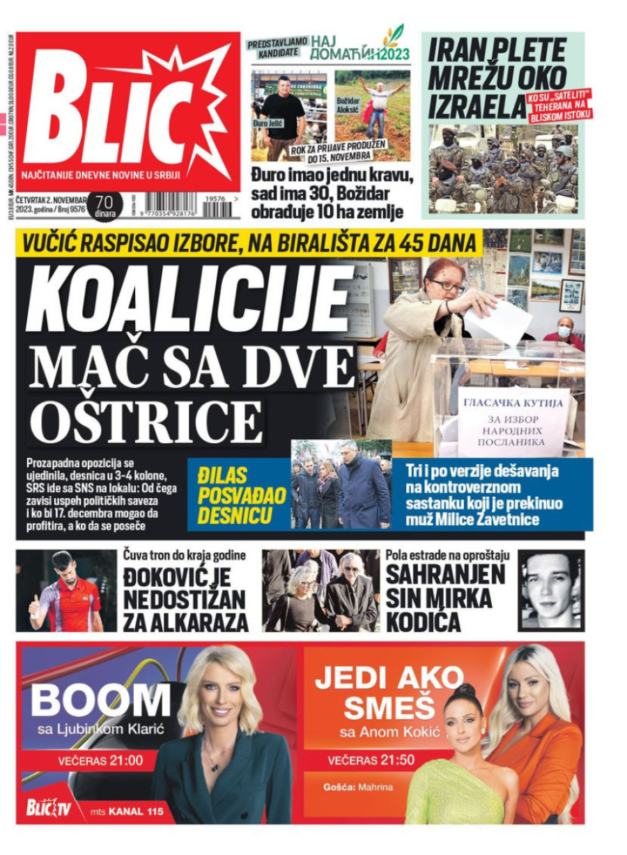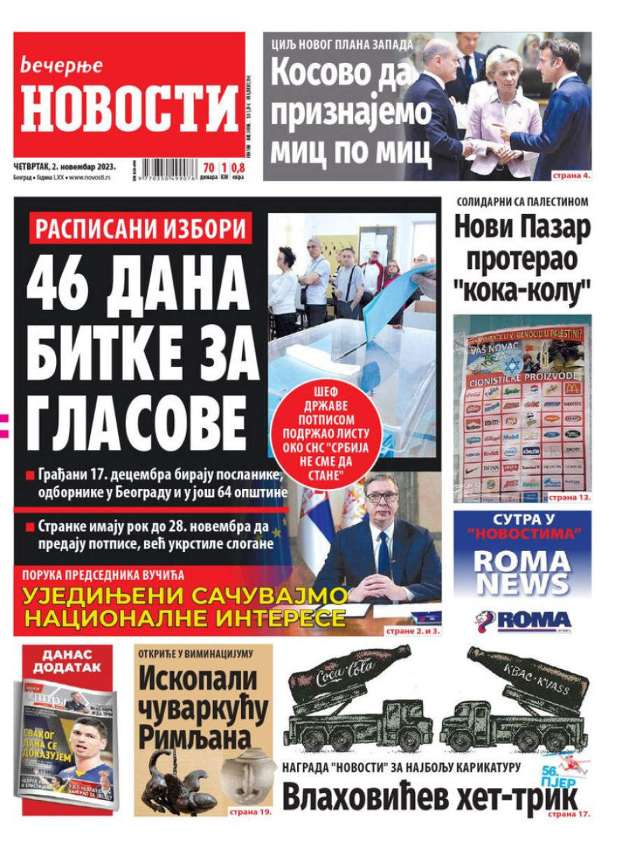 Dnevne novine u Srbiji za četvrtak 2. novembar 2023. godine na naslovnim stranama najavljuju brojne aktuelne društveno-političke teme.