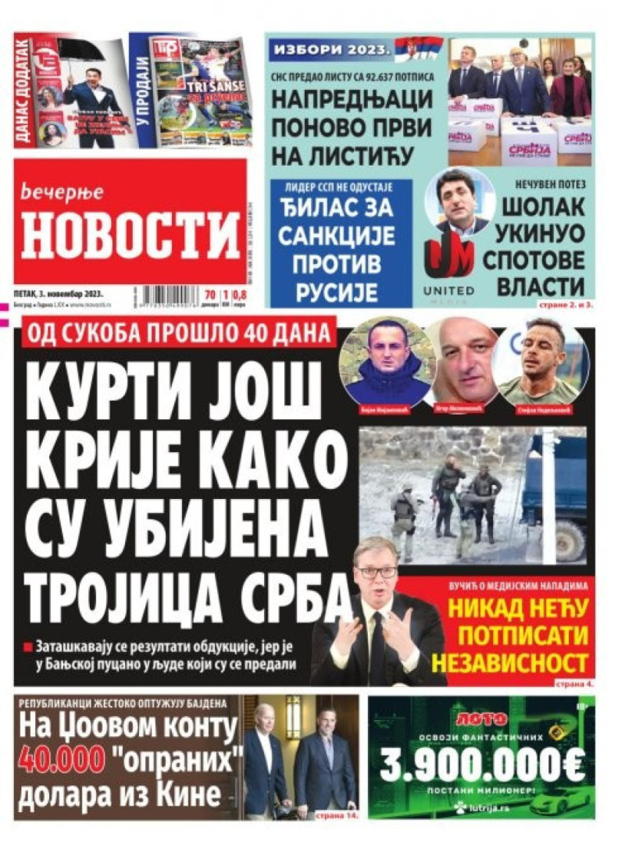 Dnevne novine u Srbiji za petak 3. novembar 2023. godine na naslovnim stranama najavljuju brojne aktuelne društveno-političke teme.