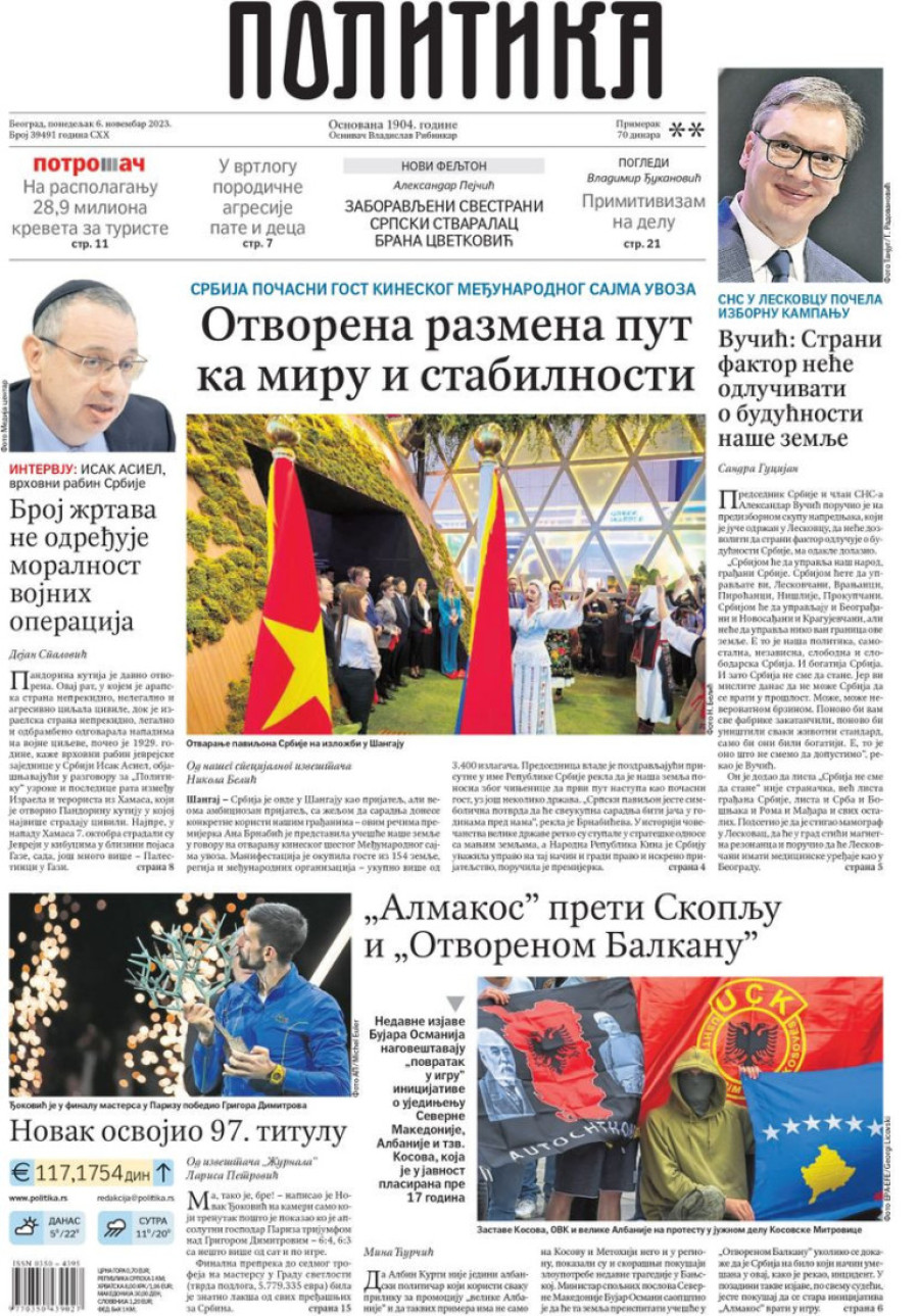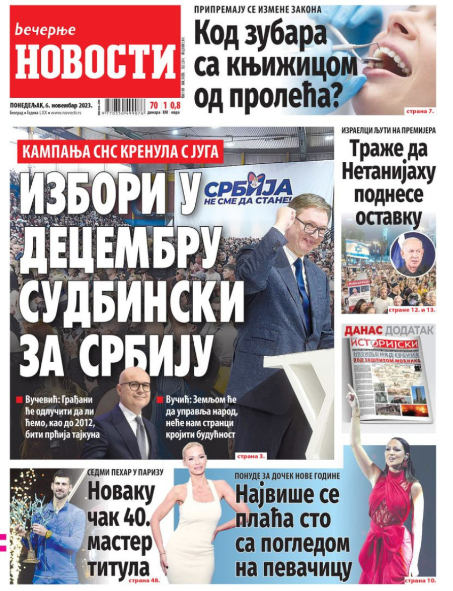 Dnevne novine u Srbiji za ponedeljak 6. novembar 2023. godine na naslovnim stranama najavljuju brojne aktuelne društveno-političke teme.