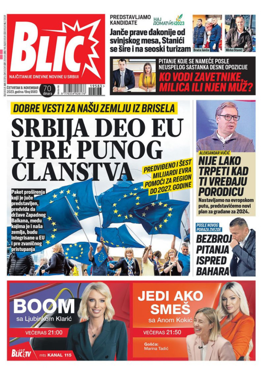 Dnevne novine u Srbiji za četvrtak 9. novembar 2023. godine na naslovnim stranama najavljuju brojne aktuelne društveno-političke teme.