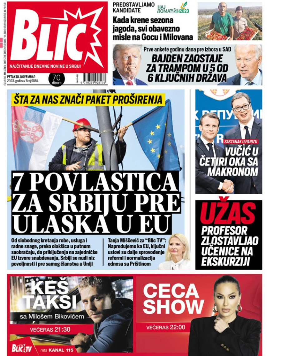 Dnevne novine u Srbiji za petak 10. novembar 2023. godine na naslovnim stranama najavljuju brojne aktuelne društveno-političke teme.