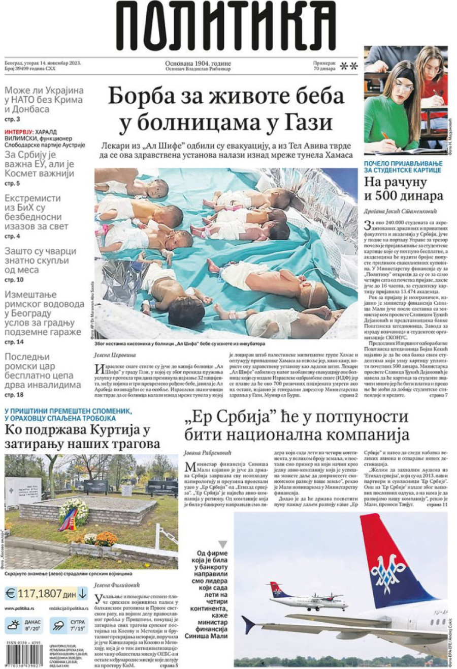 Dnevne novine u Srbiji za utorak 14. novembar 2023. godine na naslovnim stranama najavljuju brojne aktuelne društveno-političke teme.