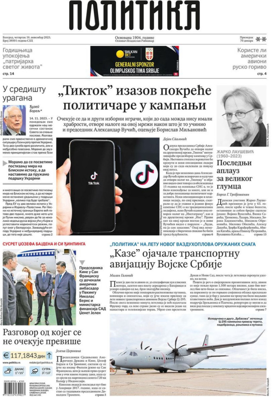 Dnevne novine u Srbiji za četvrtak 16. novembar 2023. godine na naslovnim stranama najavljuju brojne aktuelne društveno-političke teme.