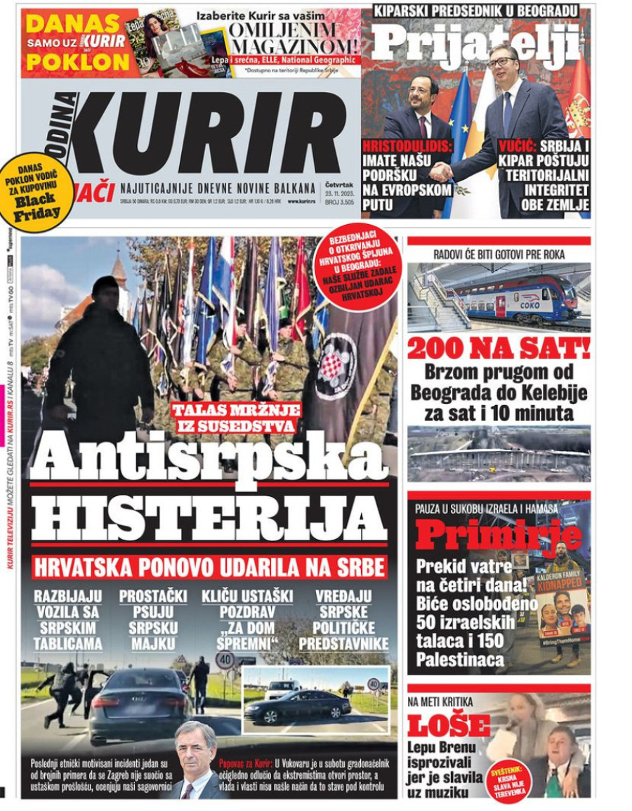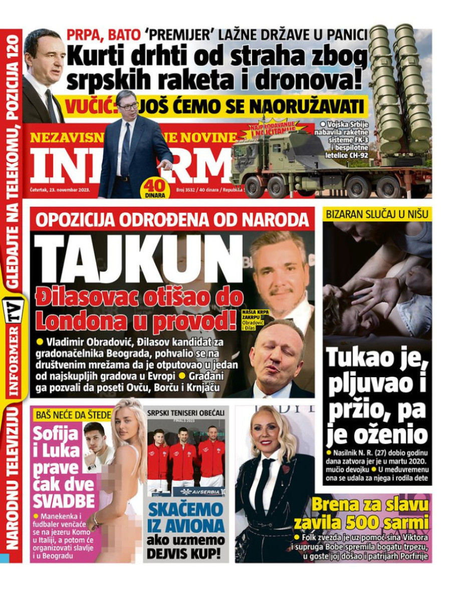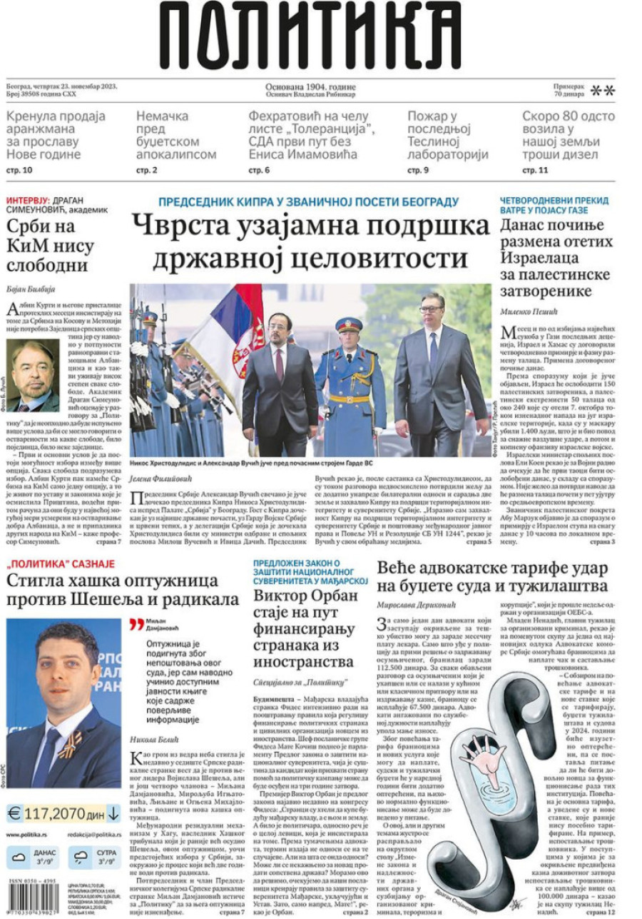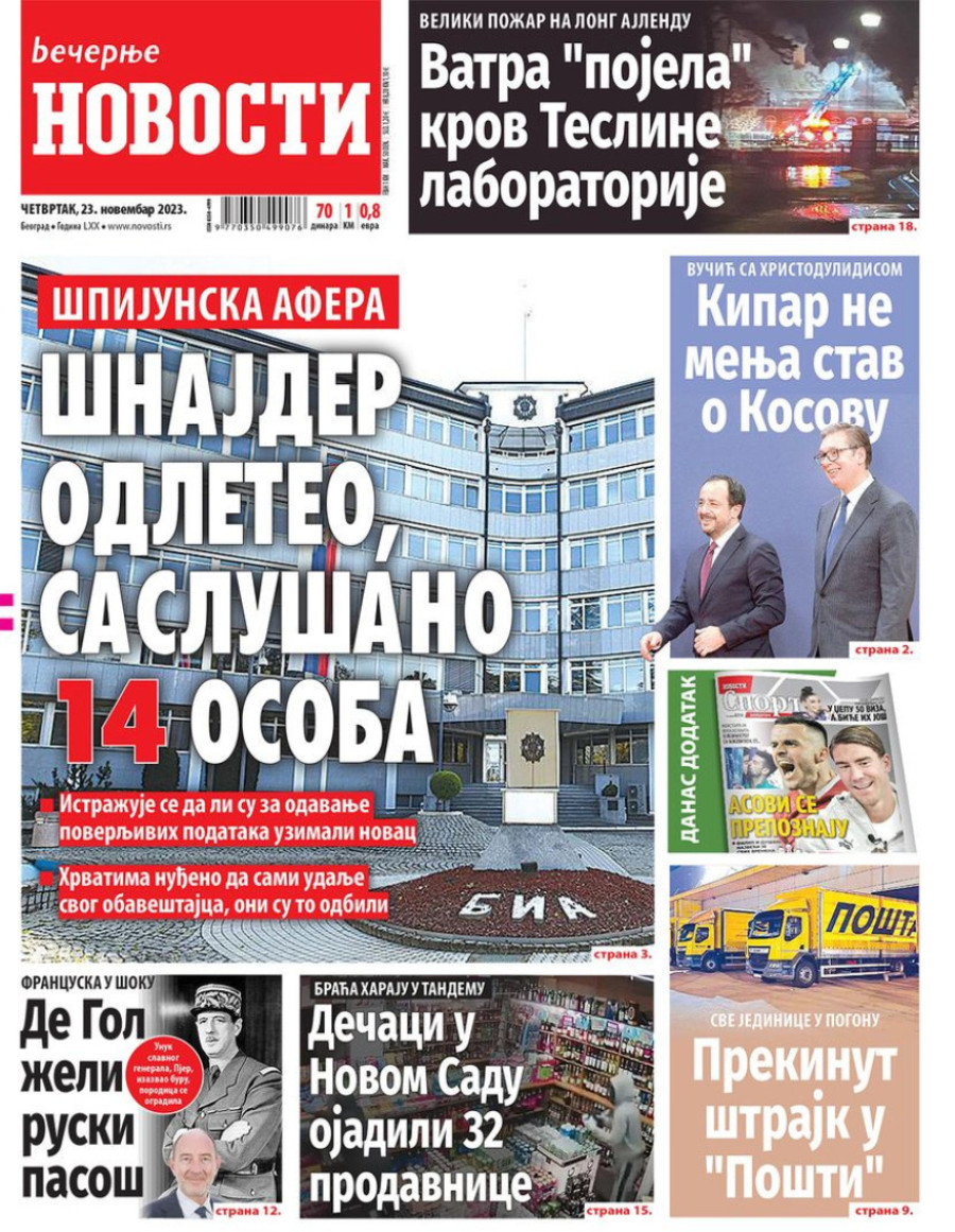 Dnevne novine u Srbiji za četvrtak 23. novembar 2023. godine na naslovnim stranama najavljuju brojne aktuelne društveno-političke teme.