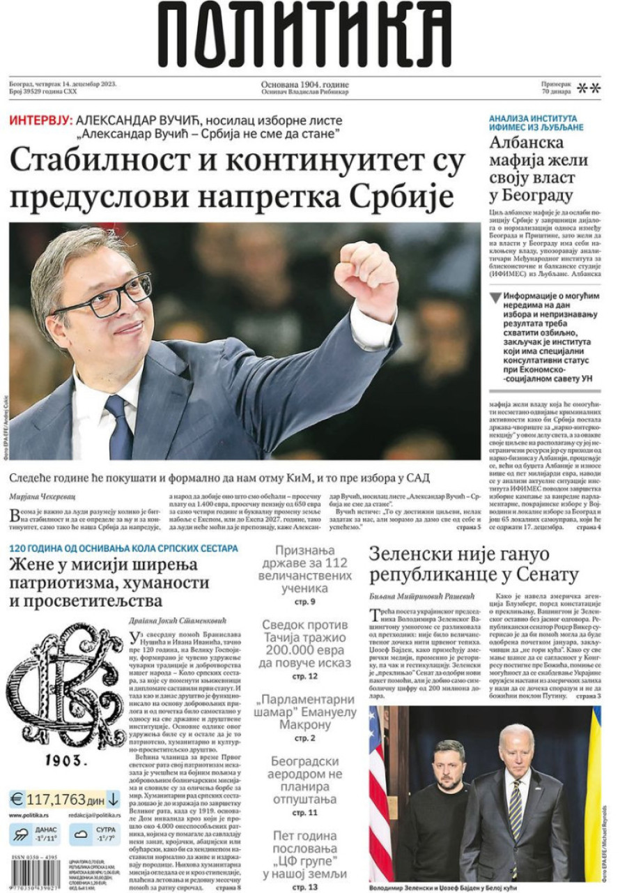 Dnevne novine u Srbiji za četvrtak 14. decembar 2023. godine na naslovnim stranama najavljuju brojne aktuelne društveno-političke teme.