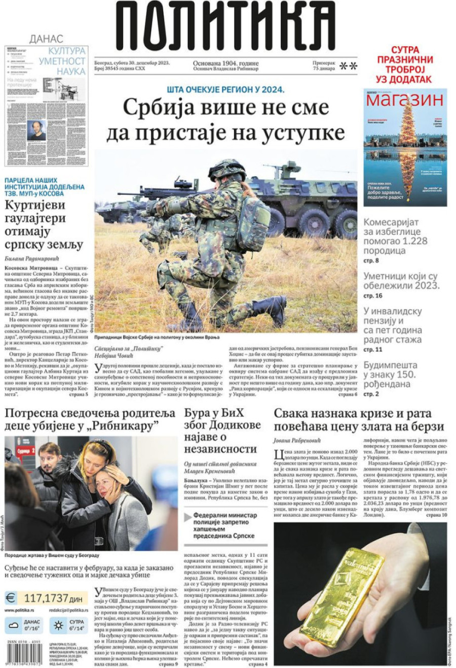 Dnevne novine u Srbiji za subotu, 30. decembar 2023. godine, na naslovnim stranama najavljuju brojne aktuelne društveno-političke teme.